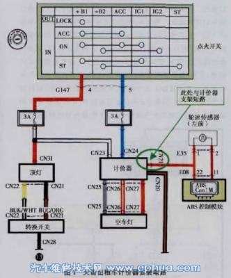 查閱該車的維修手冊(cè),按照維修手冊(cè)上關(guān)于前輪和后輪輪速傳感器就車檢查方法,對(duì)左前輪速傳感器進(jìn)行測(cè)量,結(jié)果正常。根據(jù)電路圖(圖1) ,測(cè)量A BS 控制模塊導(dǎo)線側(cè)連接器E08 端子11和端子22 分別與左前輪速傳感器連接器E35 的端子2 和端子1 闖導(dǎo)線的電阻,均小于1n ,說明線路無斷路的現(xiàn)象,但繼續(xù)測(cè)量發(fā)現(xiàn),連接器E08 的端子22 與車身搭鐵間的電阻小于1n ,異常,正常情況應(yīng)為∞,由此可以斷定,與連接器E08 端子22相連的導(dǎo)線存在與搭鐵短路的故障。對(duì)該線路進(jìn)行檢查,左前輪速傳感器到ABS 控制模塊之間的線路均正常。根據(jù)圖1分析,其計(jì)價(jià)器信號(hào)也是采集的左前輪速傳感器信號(hào),該導(dǎo)線與連接器E08 端子22 的紅色導(dǎo)線相連接。拆卸計(jì)價(jià)器進(jìn)行檢查,發(fā)現(xiàn)計(jì)價(jià)器信號(hào)線的絕緣膠皮已被磨破,正好與計(jì)價(jià)器支架短路。